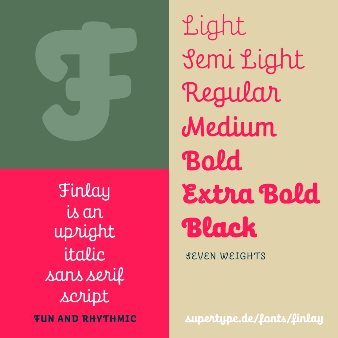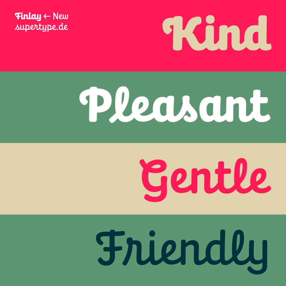 Most obviously a Script font, it also leans into a Humanist Sans-Serif as well as upright Italic letterforms. This combination gives Finlay its unique flavour, making it a friendly, warm, and utterly pleasant font — or “Echt süß!”, as Jürgen says.